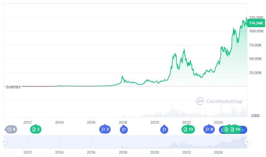 Bitcoin’s price is currently standing at $114,363. The current price represents a 6.05% and 67.43% rise weekly and annually, respectively. Even though the price is down by 9.34% from its all-time high reached this month, analysts believe that the king of crypto may never drop under $100,000 again.