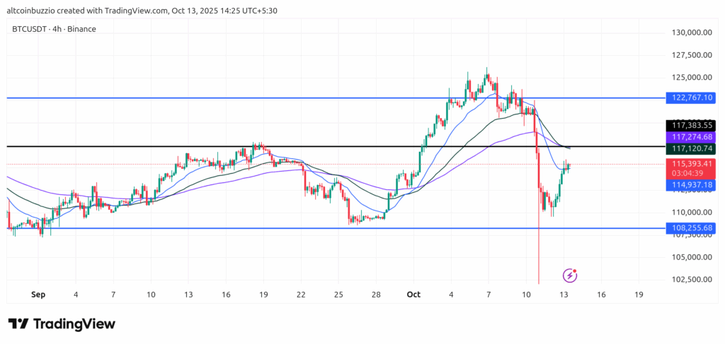 EMA50 is at $116500. EMA100 is at $110000. Bitcoin trades at $115454. Compare these values now. Price is below EMA50 resistance. Price is above EMA100 support. This shows short-term weakness. Mid-term trend holds support.