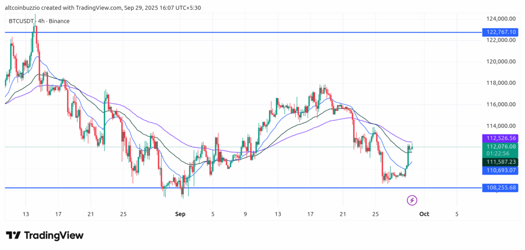 EMA50 is at $115000. EMA100 is at $108000. Bitcoin trades at $112153. Price is below EMA50. This shows a bearish short-term trend. Price is above EMA100. This suggests mid-term support holds.