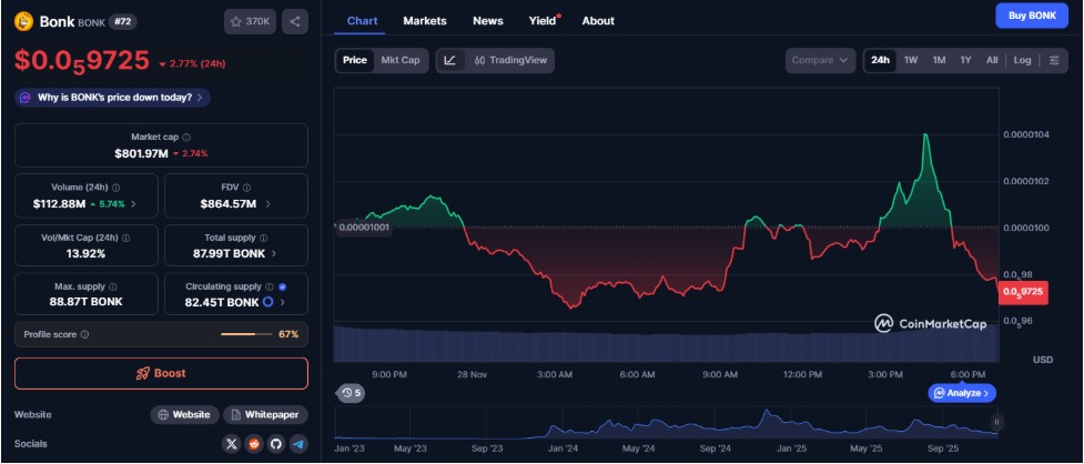 Analysts say the coin’s path through 2025 suggests slow but steady movement. BONK could recover if liquidity increases, but its performance appears more stable than explosive, which may not align with short-term trader expectations during a volatile period for meme assets.