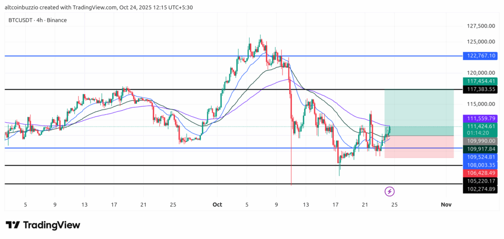 EMA50 is at $112500. EMA100 is at $109990. Bitcoin trades at $111456. Price is below the 50 EMA. Price is above 100 EMA. This shows mixed signals.