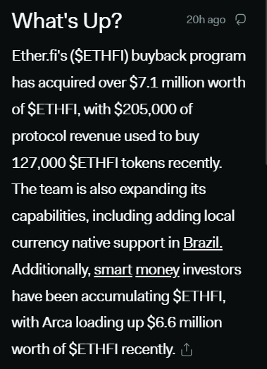 A recent tranche used $205,000 to acquire 127,000 ETHFI, with 155,000 tokens burned and 108,000 distributed to stakers. This combination of supply contraction and distribution has given the community a material story to amplify.