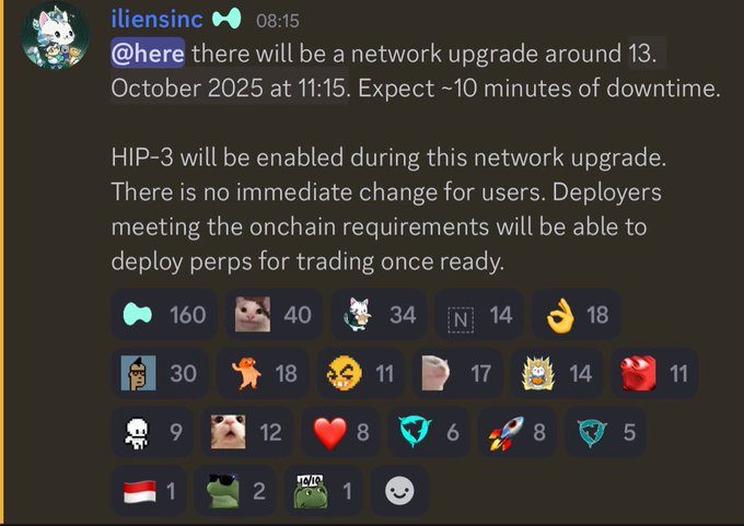An administrator confirmed in Hyperliquid’s Discord that HIP-3 enables “builder-deployed perpetuals,” emphasizing that while the upgrade introduces no immediate changes for users, it fully decentralizes the process of listing new perpetual markets.