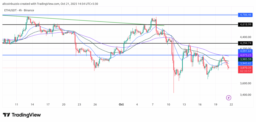 EMA50 is at $3950. EMA100 is at $3650. Ethereum trades at $3868. Compare these values to determine trend direction. The price is currently between EMAs. This suggests indecision. A breakout is likely soon.