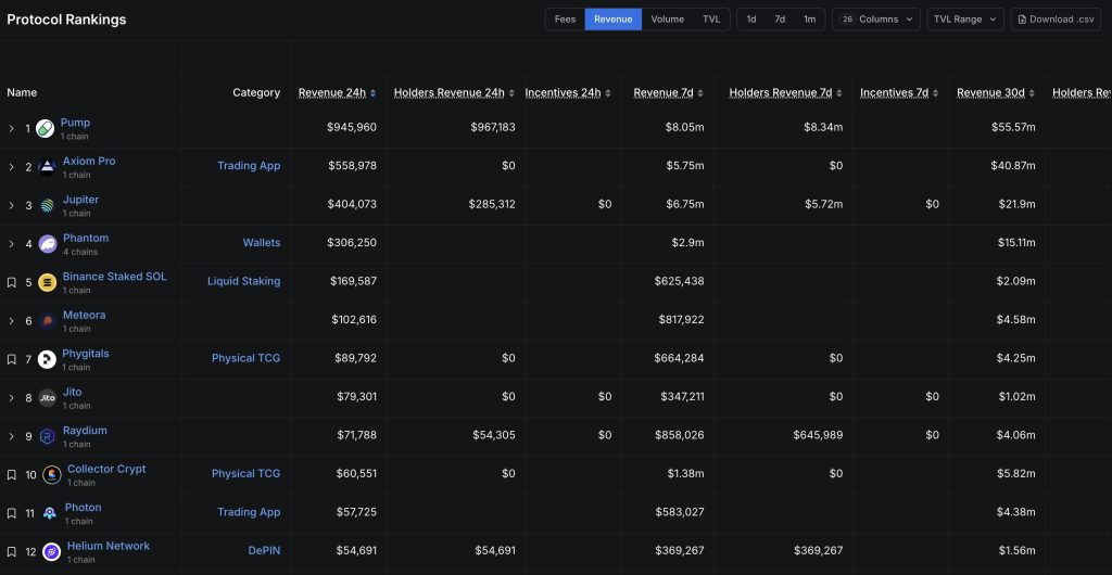 Other contributors included Raydium with $858,000, Meteora with $817,000, and Collector Crypt with $1.38 million, outperforming staking protocols such as Binance Staked SOL, which earned $625,000.