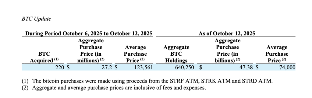 Strategy Inc. has expanded its already-massive Bitcoin treasury, acquiring an additional 220 BTC for $27.2 million at an average price of $123,561 per bitcoin during the week of October 6–12.