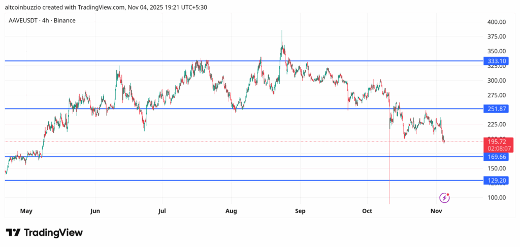 Aave is trading at $195, above the critical support of $169. Both $169 and $129 could be good entries. $251 and $333 are the closest resistances.
